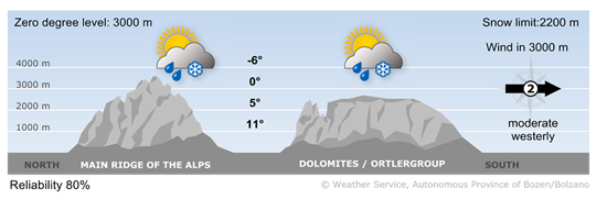 The day begins with widespread rain and snowfall above around 2200 m. However, it will soon clear up, starting in the Upper Vinschgau Valley, and the sun will prevail from the west as the day progresses.