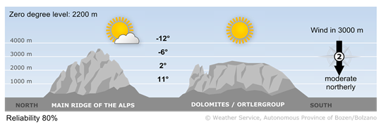 Sun and clouds will alternate, with the thickest clouds expected in the morning, particularly in the north of South Tyrol. Further south, sunshine will prevail. The north foehn will die down.