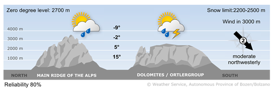 Maximum temperatures are set to fall, ranging from 17°C in Sterzing to 22°C in Bolzano.
